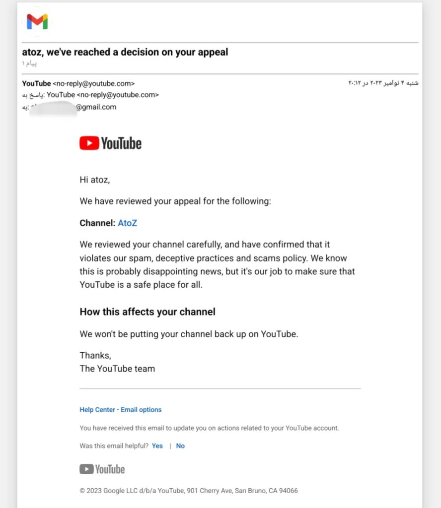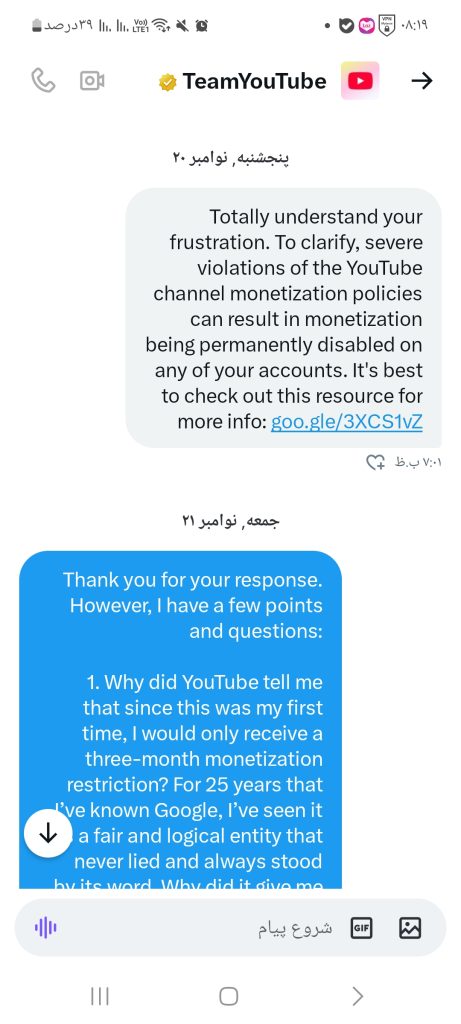 - Communication Block: Immediately following this conversation, the online chat support option was inexplicably disabled for my account, cutting off direct communication. My public appeal on the Google Community forums (Link: https://support.google.com/youtube/thread/388649243?hl=fa) received no response.